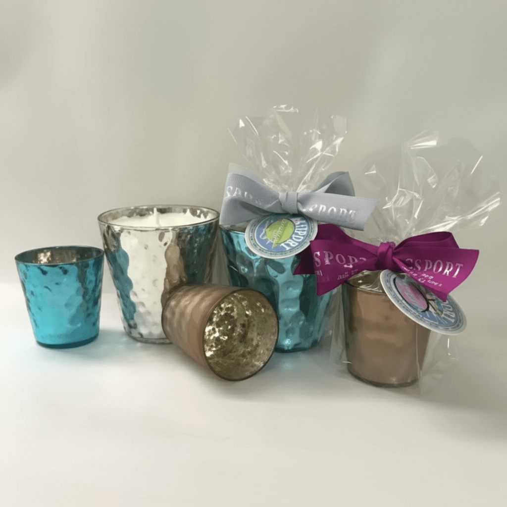14 oz Large Mercury Glass Candle Scented, big candle in a Mercury Glass container. This 14 oz Large candle in Mercury glass really shows off it’s color by standing 4 inches tall by 4 inches wide! Each candle is packaged in a clear cellophane bag to allow the color of the glass to come through. It is adorned with a Passport scent hangtag. We hand tie a custom printed Passport bow to finish off the package. This candle makes a special gift or is great to add color to any home. It comes in two colors. Available in all Passport fragrances. 60 – 64 hour burn time.