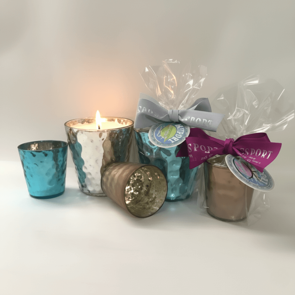 14 oz Large Mercury Glass Candle Scented, big candle in a Mercury Glass container. This 14 oz Large candle in Mercury glass really shows off it’s color by standing 4 inches tall by 4 inches wide! Each candle is packaged in a clear cellophane bag to allow the color of the glass to come through. It is adorned with a Passport scent hangtag. We hand tie a custom printed Passport bow to finish off the package. This candle makes a special gift or is great to add color to any home. It comes in two colors. Available in all Passport fragrances. 60 – 64 hour burn time.