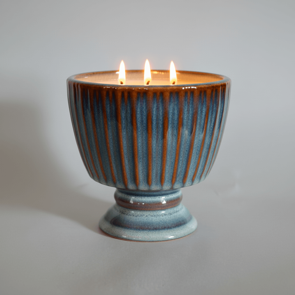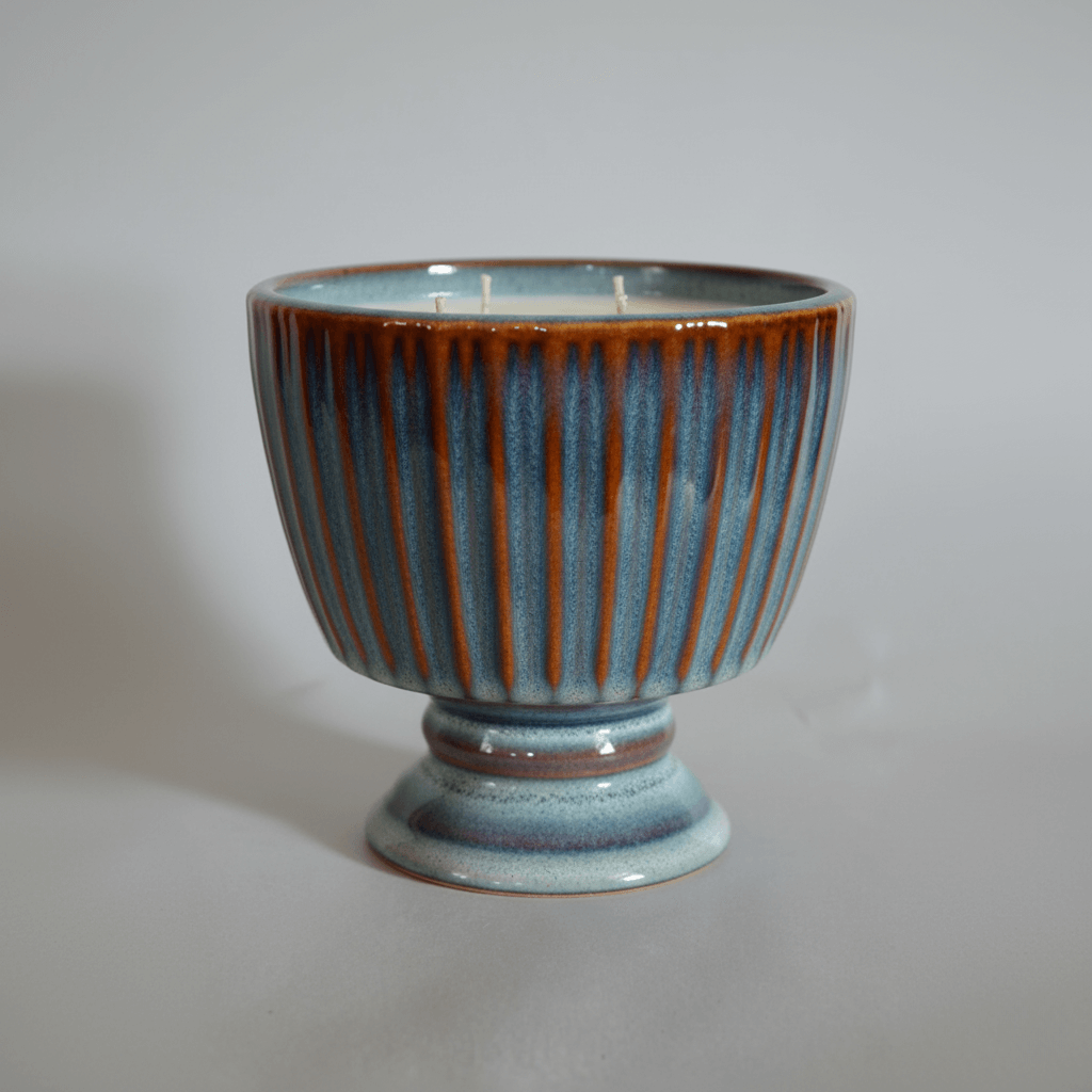 Packaged in a custom printed wrapper using our classic color palate. The largest size in the Passport line up is our Compote Candle. This 20 ounce footed container features a simple ribbing and three exquisite glazed finish choices. With two wicks, this powerful candle really knows how to throw the fragrance. You have arrived at your destination. Colors available: Distressed Mocha, Cream and Blue. 20 ounce – $33 each available in all Passport fragrances (100 – 110 hour burn time)